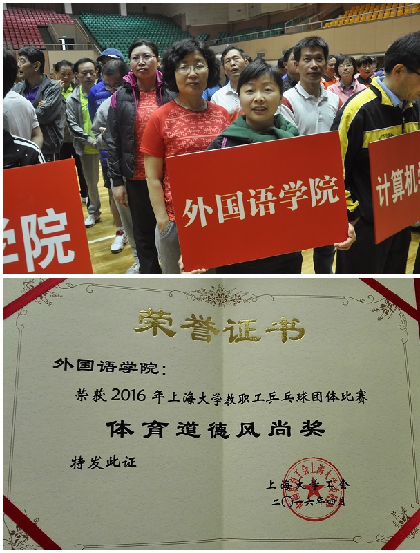 年上海大学教职工乒乓球团体比赛中,奋力拼搏,赛出了风格赛出了水平,向全校展现出外国语学院的风采和优良精神面貌,荣获