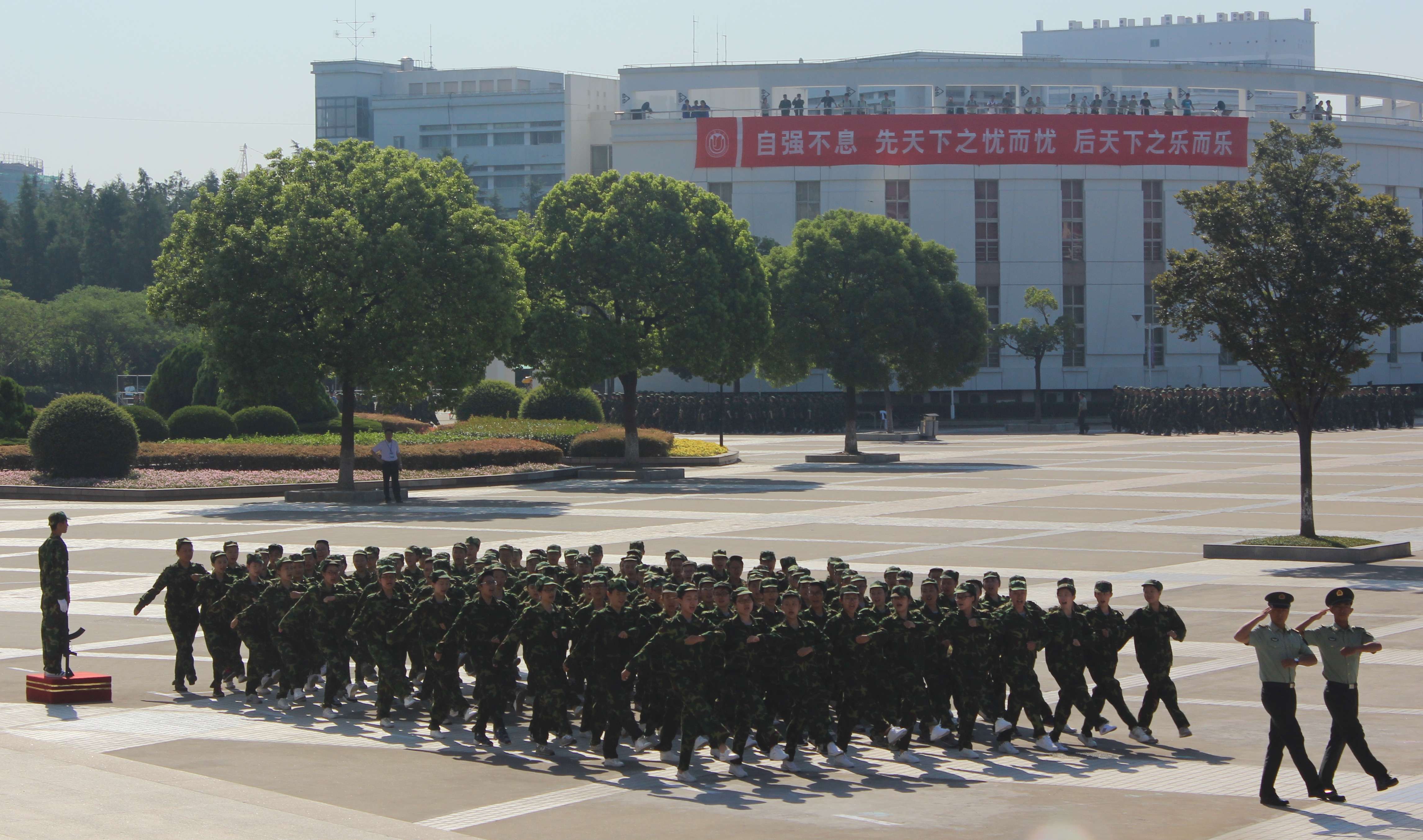 顶着火辣辣的烈日的我们,咬紧牙关,循着音乐的节奏迈开正步;在教官的细心呵护下,我们吸吮着树荫带来的丝丝凉爽;打趣教官的同时,增进了我们与教官及其他院系战友的友谊;室内的党团活动,又让我们在紧张的军训中得以喘息,丰富着我们生活的同时,还发现了许许多多才华横溢的伙伴。