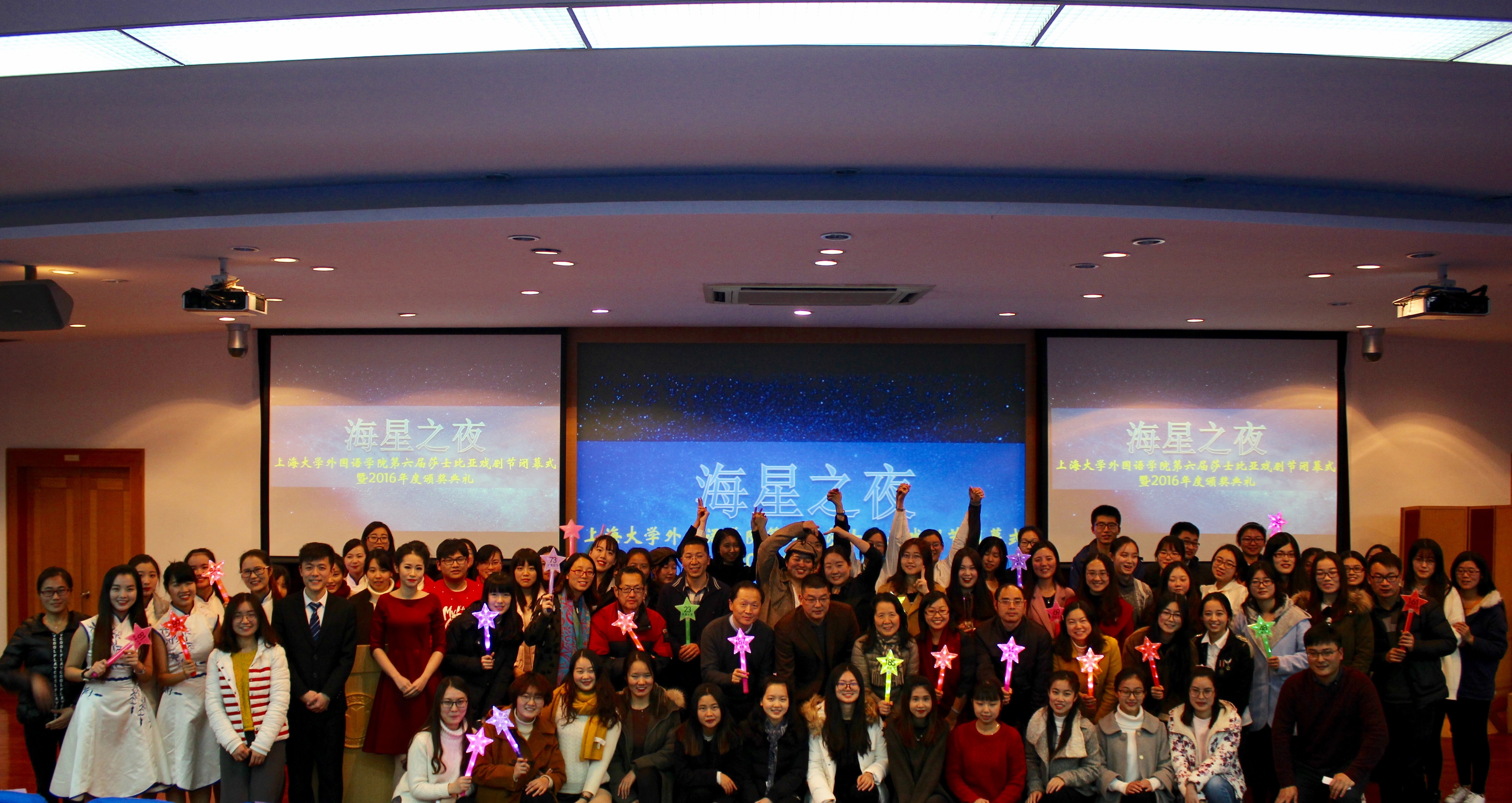 12月22日,上海大学外国语学院第六届莎士比亚戏剧节闭幕式暨2016年度"海星之夜"颁奖典礼在校本部方润华讲堂璀璨落幕。外国语学院党委书记施雯、上海大学党委研工部副部长凌长臣、学工办副主任王国建、团委书记许烁、外国语学院党委副书记曾桂娥、工会主席赵莹波、副院长邓志勇、苗福光、日语系系主任董永杰、英语系副系主任黄欣以及学院专业老师、辅导员与学院本科生研究生和其他兄弟学院学生会代表共同出席此次典礼。