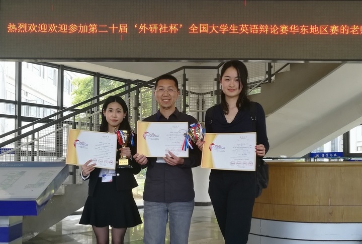4月21日至23日,第二十届"外研社杯"全国大学生英语辩论赛华东赛区复赛在安徽大学激烈开赛。我校外国语学院大三学生周文佳和电影学院大四学生吴竹韵在外国语学院陈秀猛老师的带领下从93支参赛队伍,186名辩手中脱颖而出,最终荣获一等奖及最佳辩手奖,成功晋级将于五月在北京举行的全国总决赛。