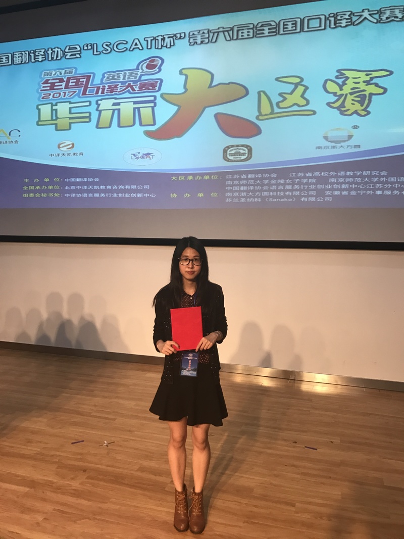 5月13日,第六届全国口译大赛(英语)"LSCAT杯"华东大区赛在南京师范大学隆重举行,华东六省一市70多所高校的150余名复赛晋级选手展开激烈角逐。在外国语学院英语系朱巧莲副教授指导下,英语系大三学生周文佳荣获本次大赛二等奖,成功晋级即将在北京举办的全国总决赛,朱巧莲老师荣获优秀指导教师奖。