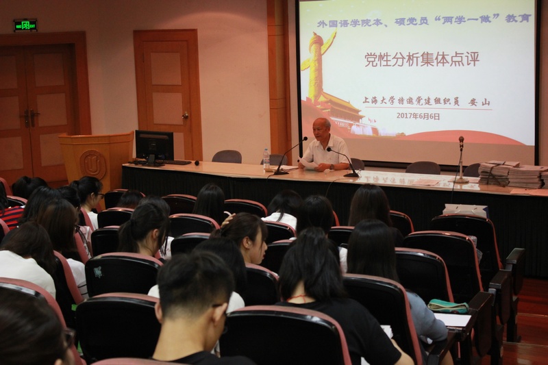 为贯彻落实"两学一做"学习教育精神,按照学院党委关于开展党性分析活动的工作部署,6月6日下午14:30,外国语学院"两学一做"党性分析专题会在J102顺利举行。上海大学特邀党建组织员安山老师担任点评嘉宾。会议由学生第一党支部书记梁苗老师主持。学院全体本、硕学生党员参加了本次党性教育活动。