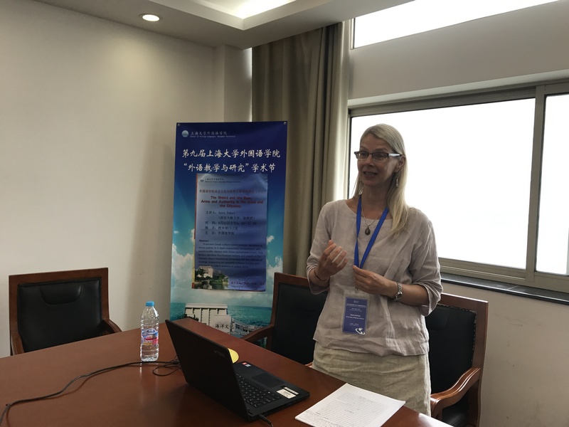 6月21日14:00—15:00,外国语学院国际化小学期系列讲座第五讲"盾与弓:论《伊利亚特》与《奥德赛》中的武器和权威"在C512会议室举行,讲座主讲人加拿大西安大略大学Aara Suksi教授,毕业于多伦多大学,获古典文学博士学位,近年来专注于希腊文学与文化研究、古希腊语言、古希腊神话以及古希腊文化中的性别研究等领域。此次讲座由英语系袁丽梅博士主持,外国语学院副院长邓志勇教授、西安大略大学Lawrence de Looze教授、英语系骨干教师与部分学生出席。