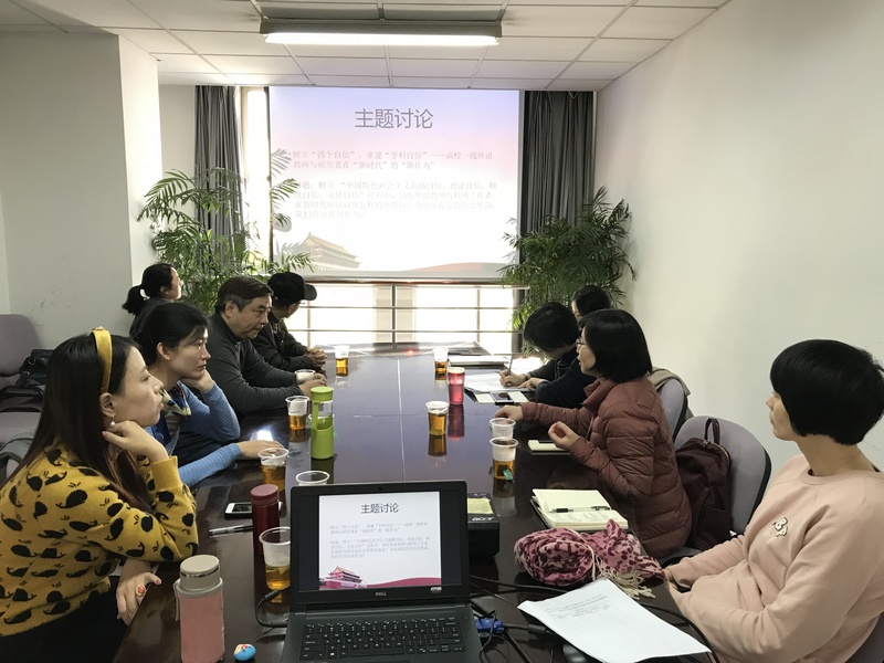 11月24日上午10:30,英语系教工第一支部在C302举行十九大精神专题学习讨论会。本次会议的主题为"不忘初心,牢记使命:树立'四个自信',重建学科自信——一线外语教师与研究者在'新时代'的'新作为'",会议由支部书记龚萍主持,英语系一支部14名党员出席,学院人事干事、组织委员郑醒芝老师代表院办直属党支部观摩。