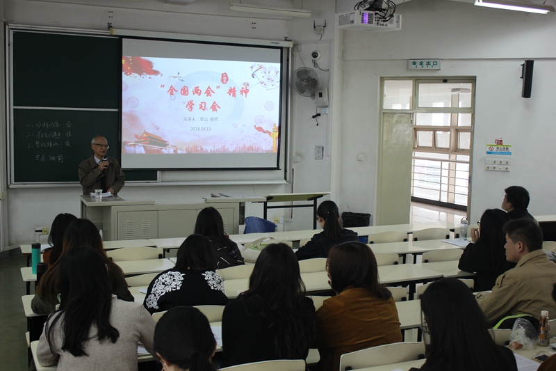 月13日上午,上海大学特邀党建组织员安山老师,在CJ207为外国语学院全体本科生和研究生党员带来了一场关于"全国两会精神"的主题学习会。外国语学院负责学生党建的朱一佳老师以及一百余名学生党员参与了本场学习会。