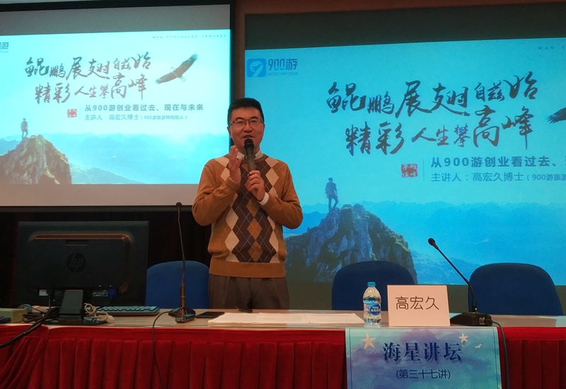 谈及自己的创业故事,作为旅游业享有盛名的大咖级人物,高先生深耕旅游业30多年,对工作热情饱满的他以900游平台为导游重新定义。"首先,导游是商品。"传统观念中导游没有任何自身标价,而没有价格的东西其价值自然无从评判;900游给予导游独有的标价,挖掘出导游的自身价值。其次导游是创造者。产品的自由化只能由人来体现,导游亦是如此。高宏久先生坦言:"我曾想过,在不久的将来,开一个旅游团叫'老高带你游日本',副标题就叫'带你看不一样的樱花'," 去往日本多达200次的他对日本旅行十分了解,900游的宗旨也是为导游创造更好的平台,让他们成为创造者。当导游不再受旅游法的限制,而能够将自身能力转化为一种产品,中国旅游业就会发展出一个全新的市场。高先生以其独特视角为我们展望旅游行业的全新面貌,在座学子得以对导游这一职业有了全新的了解。