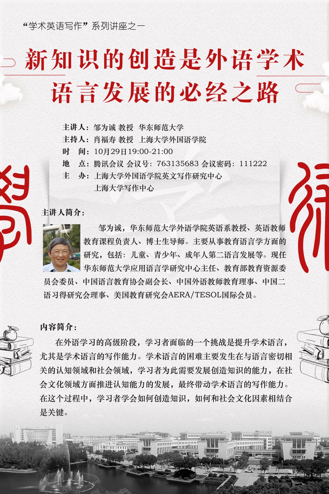 <10月29日>“学术英语写作”系列讲座(之一)新知识的创造是外语学术语言发展的必经之路