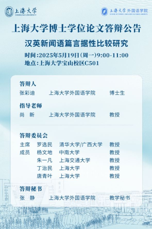 上海大学博士学位论文答辩公告:汉英新闻语篇言据性比较研究