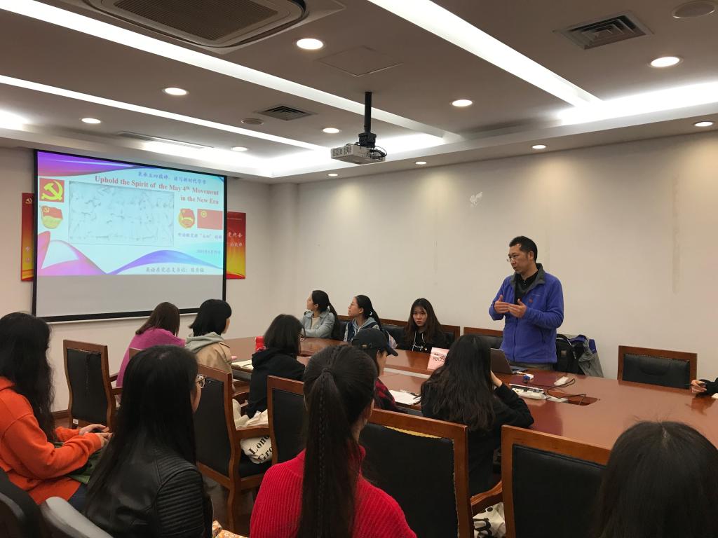 4月29日晚6点30分,在上海大学宝山校区C512举行了外国语学院外语海星微党课“五四特辑”。本次微党课邀请了英语系党支书记陈秀猛老师为同学们全程用英语讲解有关“五四”与党的主题内容。教师党员与二十余名研究生、本科生党员、积极分子共同纪念“五·四”一百周年。