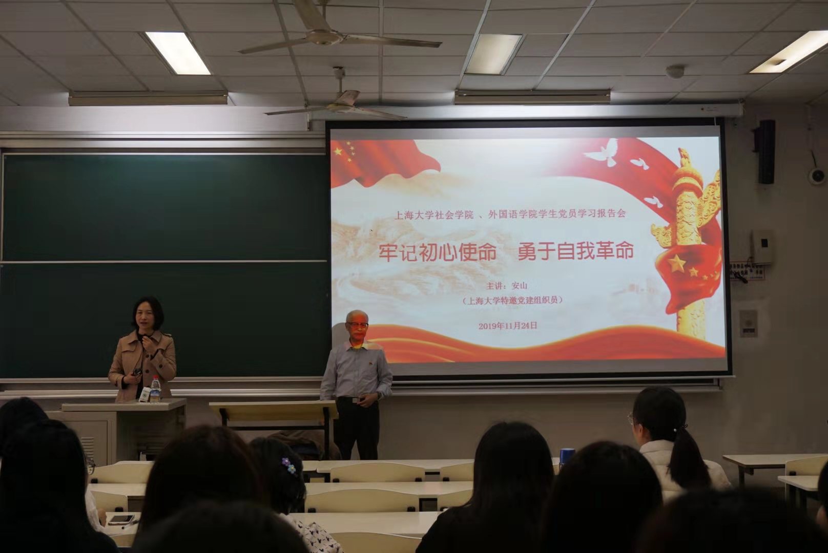 11月24日上午,以“牢记初心使命,勇于自我革命”为主题的上海大学外国语学院专题党课在校本部CJ104召开。上海大学特邀党建组织员安山作了十九届四中全会重要会议精神的分享,外国语学院党委副书记贾小琴及学院全体学生党员出席了本次活动。