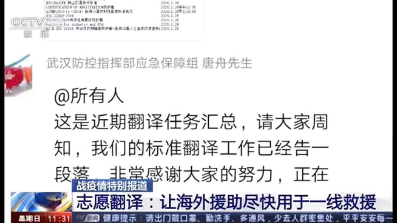 疫情当前,海外求学的交流生同样牵挂着祖国。1月27日,外国语学院2018级日语笔译的张齐同学在网上某日语翻译群得到消息称武汉得到国外捐助的一批医用物资,但无法判断其是否能用于医疗,需要大量志愿翻译人员。张齐同学在班群发出这一则消息,引起了全班同学的积极响应,大家纷纷转发朋友圈帮忙寻找更多翻译人员,同时加入名为“日语组-新冠肺炎指挥中心”这一群聊。当时时间紧、任务重,每一份日语文件都被拆成很多小段,一个人可能仅仅只能翻译不到百字,但尽管如此,大家还是在群聊里积极接任务、做翻译,在日本交流学习的张齐、马玉姣、袁渭与在国内的燕飞宇、黄怡佶等同学不断沟通协作,顺利接到任务,并及时保质完成。五天的努力没有白费,外国语学院2018级日语笔译同学参与翻译的产品标准促成了“关于采购和捐赠防疫医用耗材有关事项的公告”的出台,为抗疫工作提供了绵薄之力。此次志愿服务工作在央视战疫情特别报道中被提及,每个参与抗疫志愿翻译者无论身处海外还是国内始终心系祖国,也很高兴可以运用自己所学专业知识为国家的抗疫工作献出自己的一份力量。