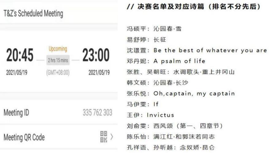 选手们和两位老师进行了积极热烈的交流探讨,都表示会抓紧决赛前的时间认真准备,以期决赛时展现自己最精彩的一面。外语竞赛指导小组的老师和选手们在工作和学习之余积极准备红色诗歌英文朗诵大赛展现了上大师生以实际行动迎接党建一百周年的饱满精神和昂扬斗志!(外语学科竞赛指导小组 供稿)