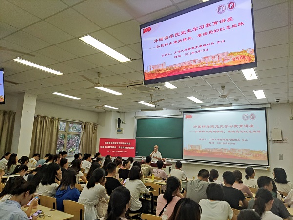 9月10日下午,外国语学院在校本部DJ203举行了学习贯彻习近平“七一”重要讲话精神专题讲座,上海大学特邀党建组织员安山老师受邀为2021级外国语学院研究生及本科生开展以“弘扬伟大建党精神,赓续党的红色血脉”为主题的专题讲座,研究生专职辅导员曹若兰老师主持。