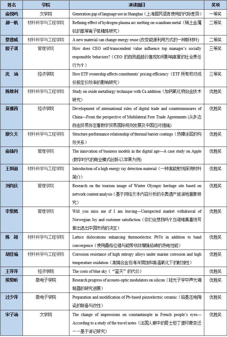 上海大学第一届研究生五分钟学术英语演讲比赛(复赛)获奖选手名单