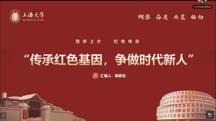接下来的主题团课分享,第一组是由2019级英语系一班团支书沈林妍和2019级日语系团支书章思怡带来的“继承百年风华,抒发青春之志”团课。她们先回顾历史,讲述了在民族危难之际青年们用热血激情演奏了一曲青春赞歌。我们作为新时代大学生,应牢记初心使命,凝聚五四精神,不辜负党的期望。接着,两位同学发挥了专业特色,运用双语讲解了上海大学的红色历史背景,提到上大溯园是师生缅怀前辈、传承上大精神的又一场所,也是校园人文环境的重要组成部分。