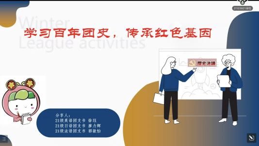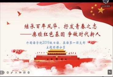 今年是中国共产主义青年团成立100年。青年有志,国家有望,百年来,一代又一代热血有为的青年们将自己奉献于党和国家的伟大事业中,用一次一次的奋不顾身,展现了炽热的青春和奋斗。5月1日,外国语学院开展了以“赓续红色基因,争做时代新人”为主题的线上团课,学院团委书记马思涵、本研团学骨干和各年级团员代表参加活动。本次活动由2021级日语系同学路伊凡主持。