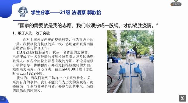然后,外国语学院团委书记马思涵老师进行了总结发言,表示本次主题团课形式新颖,采用多语种、多层次、多形式的方式,带领大家学习了团史、校史内容,讲述了革命先辈事迹和当前青年抗疫经历。她提到习近平总书记考察中国人民大学时寄语广大青年们要坚定不移听党话、跟党走,努力成长为堪当民族复兴重任的时代新人。回首百年,一代代的青年在党的领导下,用拼搏和奋斗谱写了一曲曲青春之歌,她勉励同学们作为新时代青年、作为上海大学这所红色学府的一员,也是外语专业学生,要用眼睛去发现中国的精神,用耳朵去倾听人民的呼声,用我们语言专长来传播中国的声音。