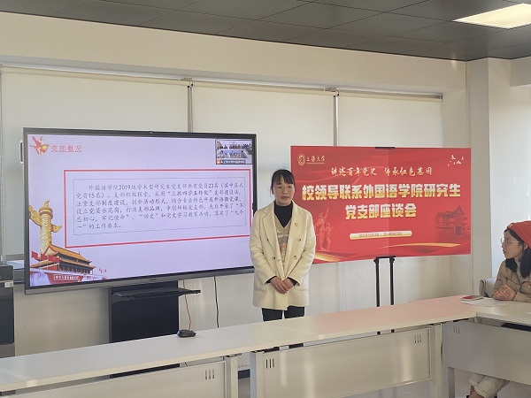 为迎接上海大学建校百年,推进党史学习教育,重温百年历史,传承红色基因,12月13日下午在校本部C501室,上海大学党委副书记、副校长龚思怡与外国语学院2019级学术型研究生党支部党员进行了深入交流。上海大学党委研工部部长魏宏,外国语学院党委书记邓志勇,院长尚新,党委副书记、副院长贾小琴,副院长戴朝晖出席本次座谈会,研究生专职辅导员马思涵、曹若兰以及2019级学术型研究生党支部全体党员参加了此次会议,会议由2021级研究生党员赵宇飞主持。