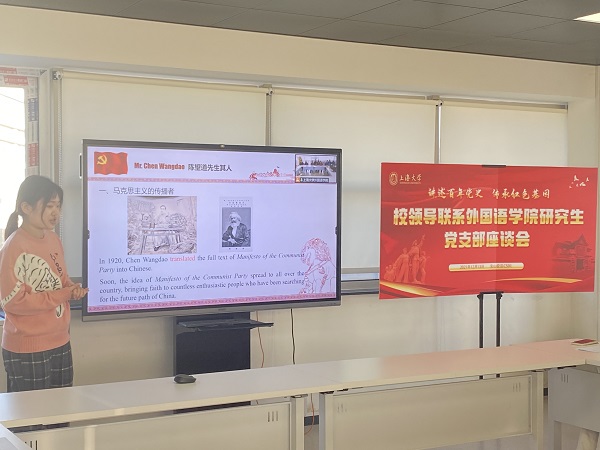 之后,2019级学术型研究生党支部成员韩欣容生动展示了外语微党课:信仰的力量-陈望道与《共产党宣言》,介绍了陈望道其人以及他在中国现代语言学上的贡献,一方面使我们了解了马克思主义中国化过程中翻译的重要性,另一方面追溯上大红色历史,以史为鉴,汲取历史智慧、激发奋进力量。
