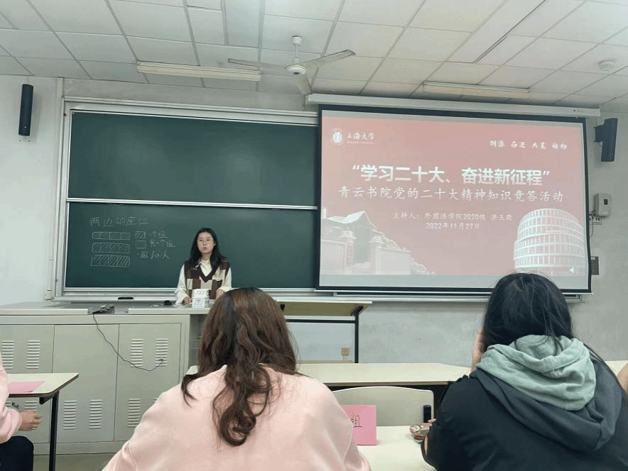 11月27日上午,上海大学青云学院—外国语学院“学习党的二十大,奋进新征程”知识竞答活动在宝山校区CJ103开展,本次活动由外国语学院2020级本科生洪玉敬同学主持。青云书院的同学们参加了此次活动。
