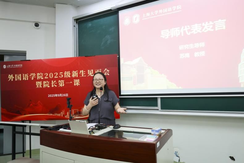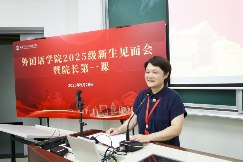 9月26日下午,外国语学院2025级新生见面会暨院长第一课在宝山校区BJ207教室隆重举行。学院党委书记吴蔚,党委副书记、院长尚新,党委副书记、副院长贾小琴,副院长戴朝晖、唐青叶、张建琴,英语系主任马拯,日语系主任赵莹波、副主任苏鹰,法语系主任王文新、副主任向维维,大学外语部主任李晓媛、副主任于梅欣,学院团委书记马思涵,研究生辅导员曹若兰及2025级全体新生出席了本次活动。本次新生见面会由外国语学院党委副书记、副院长贾小琴主持。