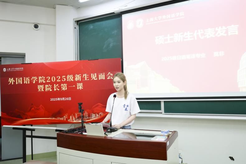 随后,2025级英语专业周悦然同学、2025级日语笔译专业莫非同学、2025级外国语言文学专业吴荆悦同学分别作为本科、硕士、博士新生代表发言。周悦然同学分享了对于语言学习的看法;她认为外语不止是一门学科,更是联结世界的纽带,同学们在语言学习的过程中应努力实现知识与能力上的双重成长,争做对国家有用的外语人。莫非同学以“敬自己”为主题,回顾了自己的求学之路,向大家分享了自己的跨文化翻译实践感悟;她认为本科学习注重广博,而研究生阶段更需专精,研究生阶段应以“不驰于空想、不骛于虚声”的态度深耕专业,通过不懈耕耘获得进步。吴荆悦同学表示她将在博士阶段珍惜宝贵的学术共同体,持续触及知识的边界,以勤奋为桨、思辨为帆,在学术道路上坚定前行,致力于文化阐述与沟通。