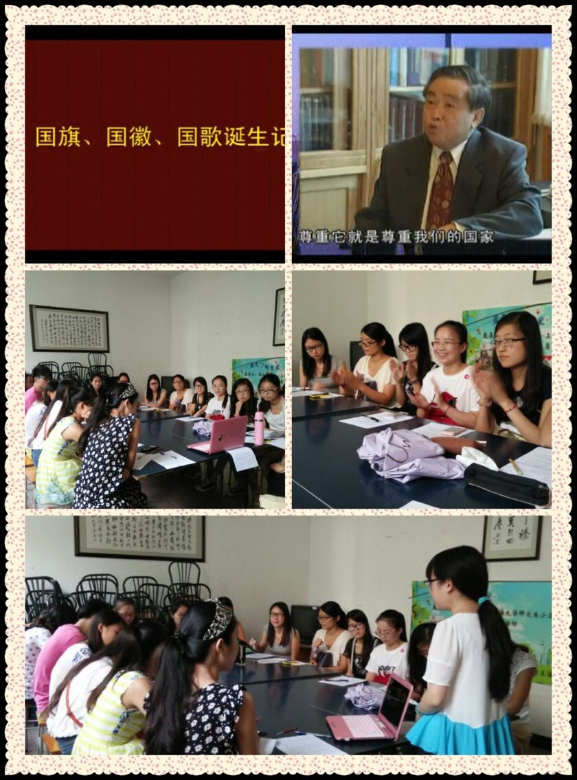 首先,大家观看了由解放军音像出版社出版的《国旗、国徽、国歌诞生记》。该视频讲述1949年4月南京解放以后,为召开新的政治协商会议和建立民主联合政府做好各项准备工作,6月15日,在周恩来主持的中国人民政治协商会议筹备会第一次会议上,决定了以政治协商会议的名义,通过新闻媒体向全国公开征集国旗、国歌、国徽的启事。这次征集活动极大的激发了亿万中国人民的爱国热情,社会各界的人们不管是否在艺术领域工作,都以极大的热情纷纷拿出了自己认为理想的方案,用这种方式表达对新中国的热爱。通过观看国旗、国歌、国徽的故事,回顾历史,再现亿万中国人民的爱国热情,同学们心潮澎湃、感慨万千。