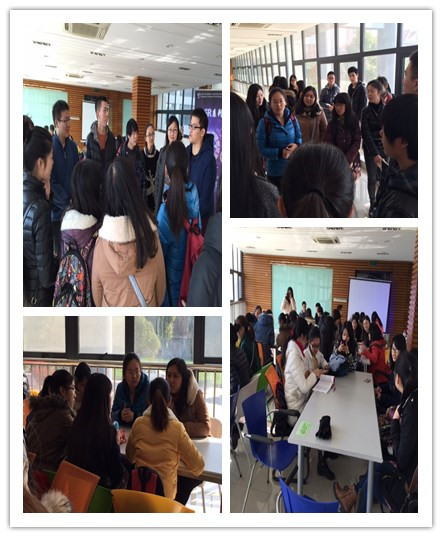 在前期对学生需求进行充分调研的基础上,本项目第一次活动于12月13日12:00——16:30,在东区管理学院大楼二楼平台活动区举行。外国语学院十余名同学和管理学院三十多名同学在这次见面会上进行了良好的互动。此外,另有管理学院的校友刘士一和刘兵为同学们带来了精彩的讲座。大家纷纷表示受益匪浅。