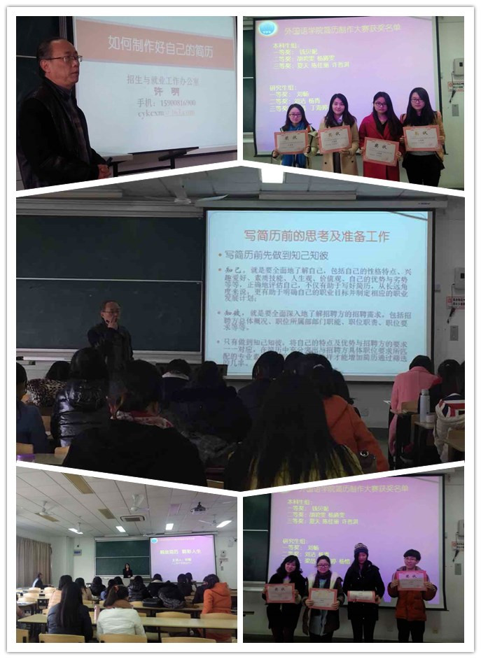 2015年1月9日下午2点,外国语学院简历写作指导讲座暨简历制作大赛颁奖活动在AJ304举行。本次讲座由外国语学院主办,汪旭娟老师主持,邀请了来自上海大学招生与就业工作办公室的许明老师。