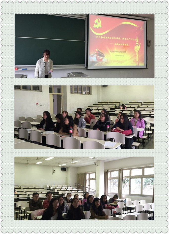 11月22日下午,外国语学院学生第五党支部全体党员在CJ204开展了11月份专题组织生活会。本次会议由党支部书记曾云主持,主题为"学习孙晋良院士优秀事迹,践行'三严三实'要求"。