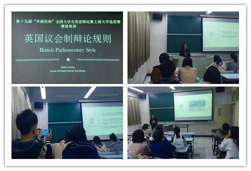 3月 18日下午,第十九届"外研社杯"全国大学生英语辩论赛上海大学选拔赛赛前培训在A110顺利举行。本届辩论赛校选赛由上海大学教务处、共青团上海大学委员会联合主办,外国语学院、上海大学英语演讲与辩论社共同承办。目前,共有包括外国语学院、理学院、悉尼工商学院、社会学院、通信学院、上海电影学院、社区学院等7个学院在内的12支队伍报名参赛,报名学生涵盖本科生、研究生,跨学院、跨专业组队报名成为此次比赛的一大亮点。
