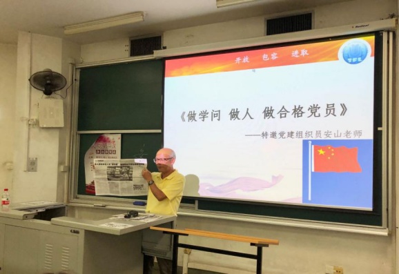 党课伊始,安山老师首先恭喜所有新生同学完成了人生中的又一次华丽转身,随后安山老师从"做学问、做人、做合格党员"三个方面展开了这次党课。首先,安山老师希望同学们能够心无旁骛做学问。安老师指出,考入高校并非进入了保险箱,因而希望同学们要励志求学,自律和自我要求应该在入学第一天就要做好。安山老师以身边鲜活的事例来警示同学们,希望同学们能够严格遵守学校的各项要求,顺利完成学业。安山老师又强调了做人是一门学问。安老师引用习近平总书记的讲话"广大青年人人都是一块玉,要时常用真善美来雕琢自己,不断培养高洁的操行和纯朴的情感,努力使自己成为高尚的人",告诫同学们在现实生活中要经得住诱惑,不能随波逐流,在虚拟世界中明辨是非,加强自己的鉴别能力,做到诚信友善,严于律己。