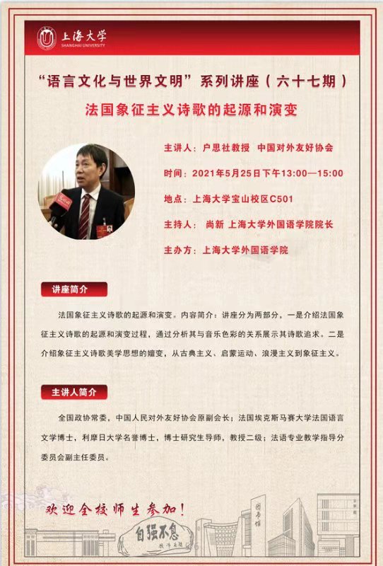 <5月25日>“语言文化与世界文明”系列讲座(六十七期)法国象征主义诗歌的起源和演变